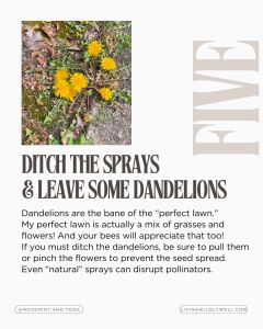Personally, my idea of a perfect lawn is a mix of grasses and flowering plants like clover. If you don’t love dandelions in your lawn, consider harvesting the flowers or pulling the plant from the root, no sprays needed. Many pesticides, even natural ones, can disrupt beneficial insect populations and reduce biodiversity.