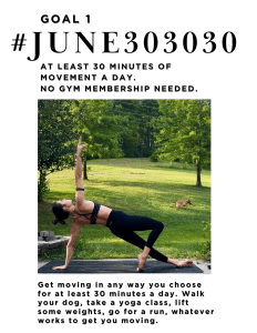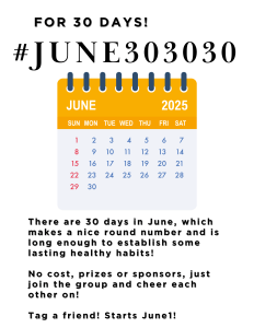 That’s why I created #June303030. It is something that I’ve been thinking about for a while now. I wanted to share a realistic way to habit stack behaviors that are healthy, reasonable, sustainable and can actually make a long term difference in your life regardless of age, background, or fitness level. So here are the three simple goals.